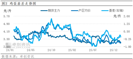 本周雞蛋期貨主力合約2602行情上漲,最低收盤價格為2876元/500千克,最高價格為2947元/500千克。周一期貨開盤短暫拉漲后回落,期價重心跌至2900元/500千克以下。之后盤面漲跌兩難,期價在2870-2900元/500千克區間內震蕩調整。周三午盤后盤面多頭發力,期貨觸底反彈,期價最高漲至2970元/50千克附近。截止到本周四合約2602收于2946元/500千克,目前期現貨基差在-66元/500千克。