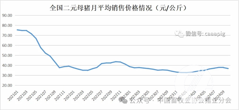 1、2024年10月份全國二元母豬銷售價格36.84元/公斤,環比下跌2.4%,同比上漲7.9%。