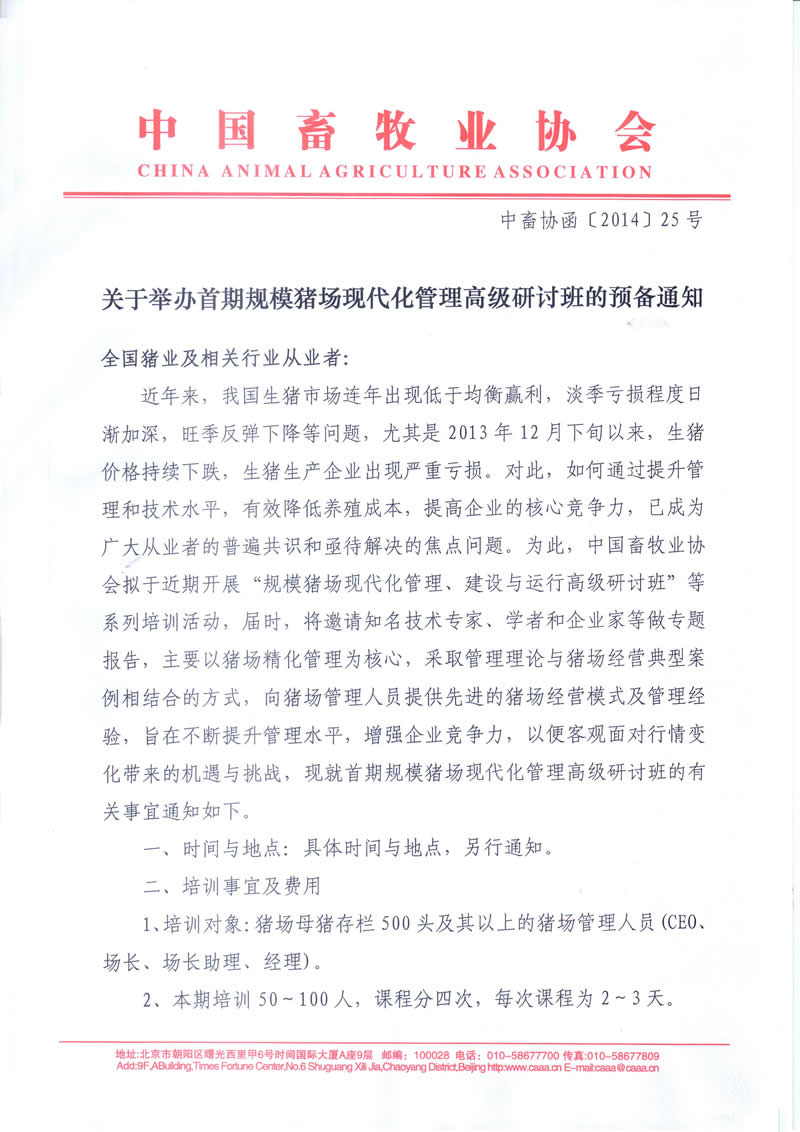關于舉辦首期規模豬場現代化管理高級研討班的預備通知