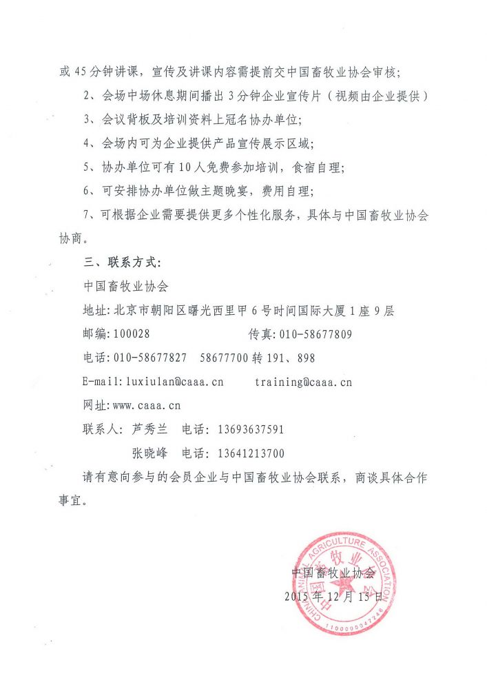 1、協辦單位負責人作為本次會議嘉賓,會上10-15分鐘企業宣傳或45分鐘講課,宣傳及講課內容需提前交中國畜牧業協會審核;