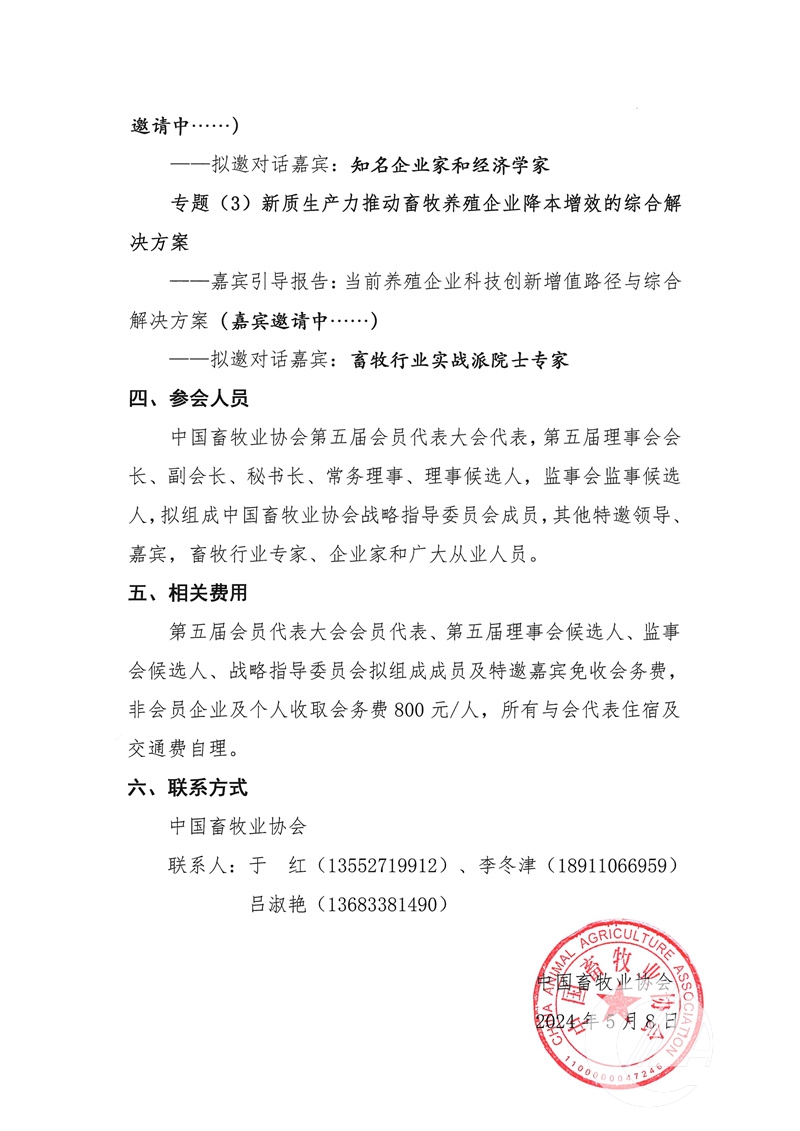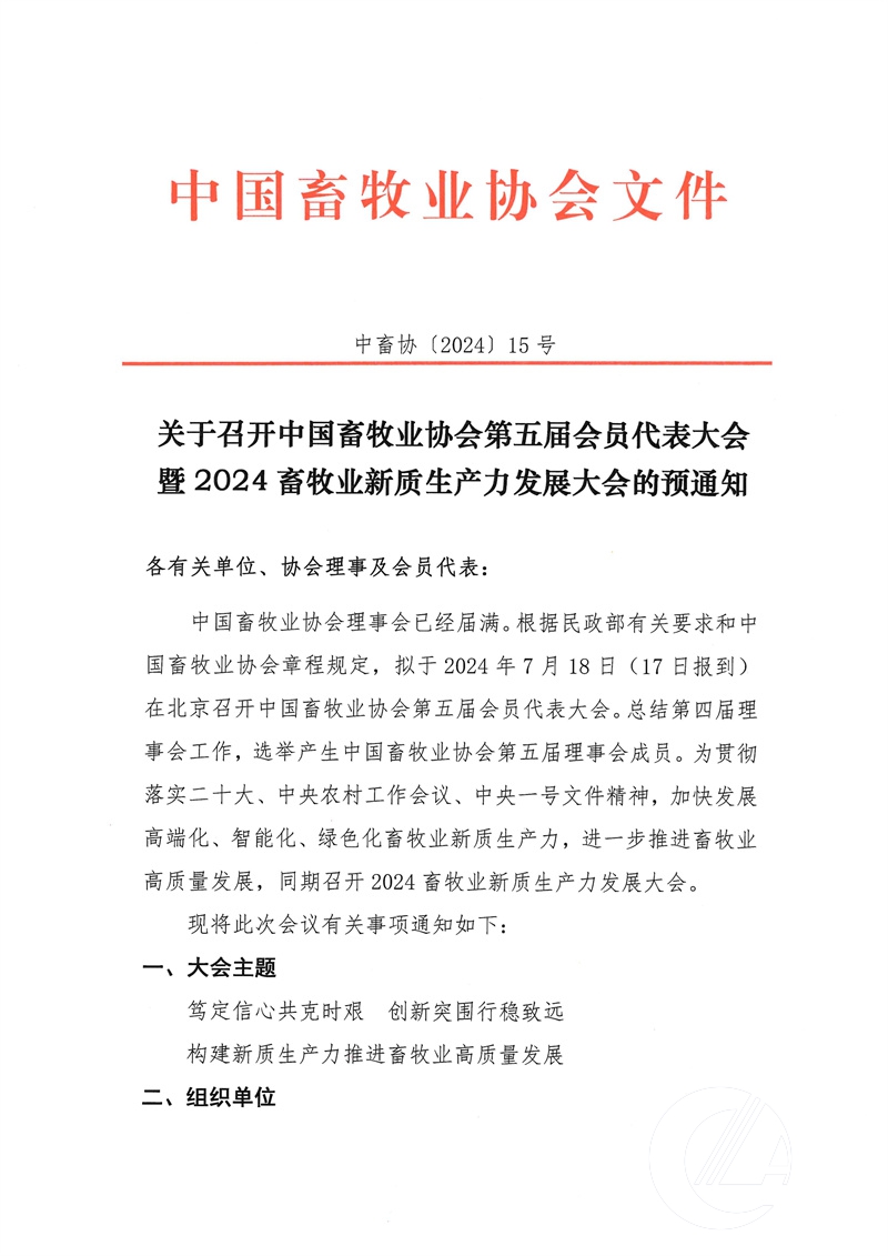 關于召開中國畜牧業協會第五屆會員代表大會暨2024畜牧業新質生產力發展大會的預通知