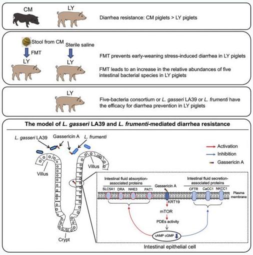從江香豬是一種我國貴州省特有的地方豬種,它具有肉嫩味美、抗病力強、耐粗飼等特點。2013年晏向華課題組研究發現了將健康的從江香豬糞便微生物移植到長×大二元雜交仔豬腸道內,可顯著降低仔豬早期斷奶腹瀉發生率,與此同時,仔豬糞便微生物區系發生顯著變化,即長×大二元雜交仔豬糞便微生物多樣性、物種組成、基因功能等向從江香豬仔豬的糞便微生物區系轉變。課題組歷時6年,通過比較糞便菌液灌服組和生理鹽水灌服組仔豬糞便微生物的相對豐度,篩選出5種與腹瀉抗性相關的關鍵候選微生物(L. frumenti、L. gasseri LA39、B. pullicaecorum、E. hallii、B. hansenii)。動物驗證試驗結果表明差異微生物L. gasseri LA39 和 L. frumenti具有較顯著的抗腹瀉功能。進一步分析表明L gasseri LA39 和 L frumenti介導的腹瀉抗性依賴于其分泌的gassericin A細菌素。組織水平和細胞水平的免疫熒光試驗表明gassericin A可結合在豬腸上皮細胞質膜上。Co-IP等功能試驗證明了gassericin A可通過宿主KRT19蛋白結合在腸上皮細胞質膜,并激活胞內mTOR介導的磷酸二酯酶活性,導致cAMP和cGMP水平下調,繼而促進腸液吸收相關蛋白的表達并抑制腸液分泌相關蛋白的表達,從而降低早期斷奶仔豬腹瀉發生率。該研究發現了微生物來源的細菌素可通過靶向宿主腸道起到抗腹瀉的效果,為實施腸道菌群干預改善仔豬腸道健康提供新思路與重要資料。