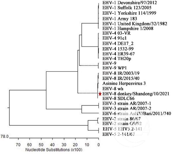 發表的論文題目分別為《Identification of equine herpesvirus 8 in donkey abortion: a case report》【論文鏈接:https://pubmed. ncbi.nlm.nih.gov/34991640/】、《The emergence of viral encephalitis in donkeys by equid herpesvirus 8 in China》【論文鏈接: https://pubmed.ncbi.nlm. nih.gov/35308333/】、《First detection and phylogenetic analysis of porcine circovirus 3 in female donkeys with reproductive disorders》【論文鏈接:https://pubmed.ncbi.nlm.nih.gov/34537035/】、《MRKNs: Gene, Functions, and Role in Disease and Infection》【論文鏈接:https://www. frontiersin. org/articles/ 10. 3389 /fonc.2022.862206/full】、《驢源馬皰疹病毒8型的分離鑒定與生物信息學分析》、《山東、河南、河北驢群馬動脈炎病毒、馬皰疹病毒8型的檢測與分析》、《馬皰疹病毒8型熒光定量PCR檢測方法的建立與應用》;同時還申報發明專利《一種用于快速檢測馬皰疹病毒8型的熒光定量PCR試劑盒》1項,圍繞《馬皰疹病毒8型的診斷和防控》撰寫、申報團體標準和山東省地方標準各1項。上述一系列研究成果為今后開展馬皰疹病毒8型的致病機制研究、針對性的疫苗研發以及快速診斷試劑開發奠定了堅實的基礎,也將為養驢業的健康發展提供技術支撐。