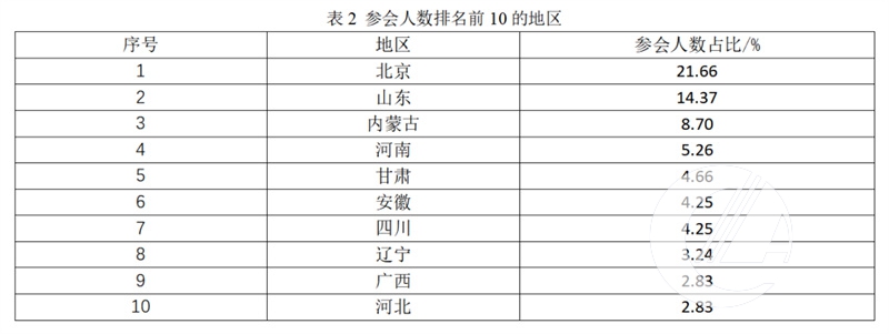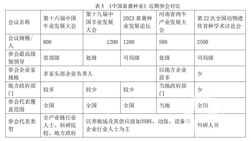 從參會人群覆蓋范圍來看,作為全國性的行業會議,全國31個省(直轄市、自治區)幾乎都有會議代表前來參會,得益于主辦方中國畜牧業協會的號召力加上陽信距離北京較近的優勢,來自北京的會議代表人數排名第一,超過20%;來自東道主山東的會議代表人數排名第二,約占15%;來自內蒙古的會議代表人數排名第三,約占9%,其中一半左右是來自通遼地區的政府機構和企業代表(表2)。