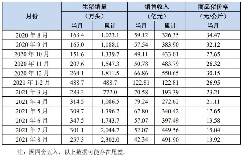 2021 年 8 月份,公司銷售生豬 257.3 萬頭(其中仔豬銷售 15.6 萬頭),銷售收入 42.34 億元。其中向全資子公司牧原肉食品有限公司及其子公司合計銷售生豬 30.3 萬頭。