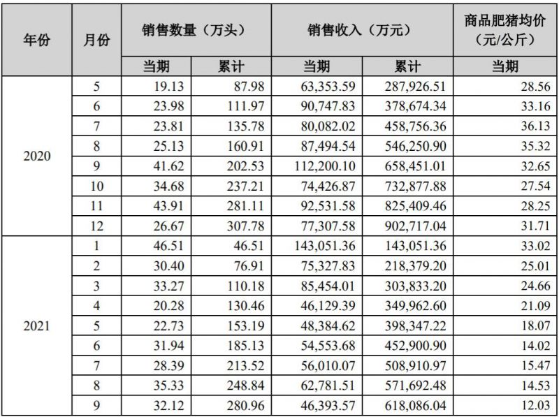 2021 年 1-9 月銷售商品豬 280.96 萬頭(其中仔豬銷售 48.12 萬頭),銷售收入618,086.04 萬元,銷售均價 20.28 元/公斤(商品肥豬均價為 18.94 元/公斤),同比變動