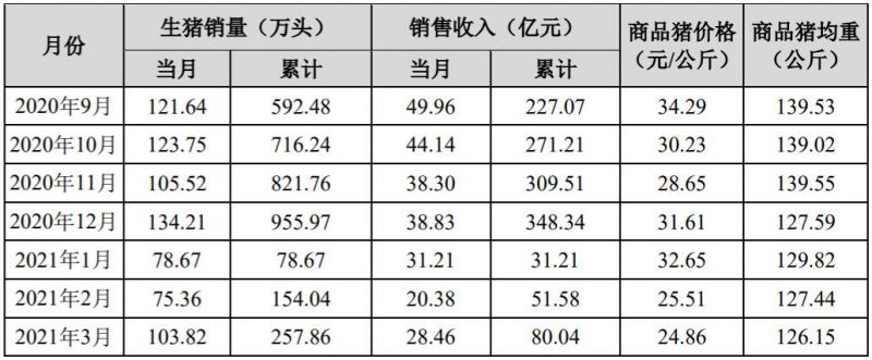 2021年1-9月,公司累計銷售生豬1,183.55萬頭,同比增長99.76%;累計銷售收入256.40億元,同比增長12.91%。