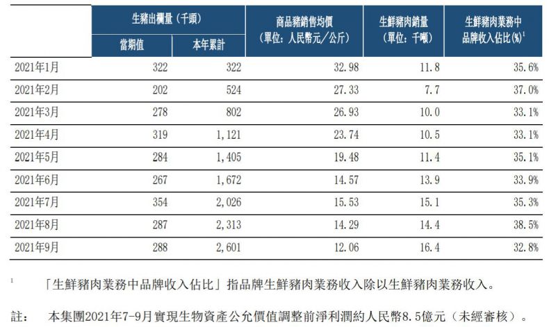 9月份商品豬銷售均價為每公斤12.06元人民幣,按月減少15.61%;生鮮豬肉銷量為1.64萬噸,按月升13.89%;生鮮豬肉業務中品牌收入占比為32.8%。