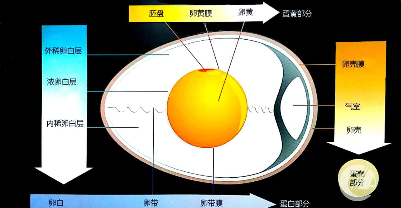 當我們把雞蛋橫切開來,會清晰地看到其內部結構的截面圖。這一部分展示了雞蛋從外到內的詳細構造,包括蛋殼、氣室、卵殼膜以及蛋白和蛋黃等各個組成部分。通過這個截面圖,我們可以更深入地了解雞蛋的內部構造及其各個部分的相互關系。